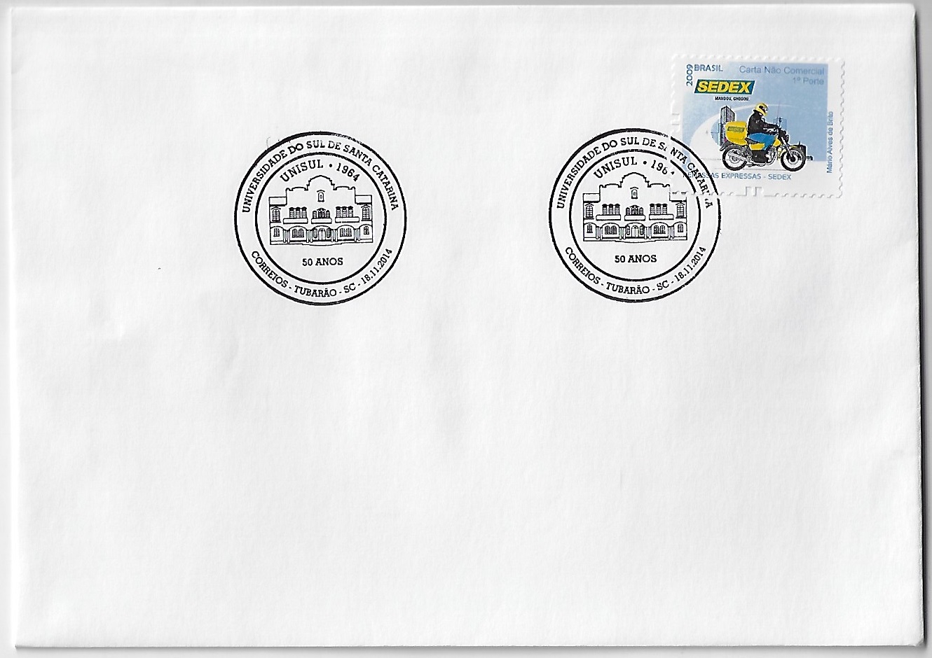 | 79231 | 2014, envelope com carimbo comemorativo aos 50 Anos da Universidade do Sul de Santa Catarina - Unisul, de Tubarão | 10,00 | Foto |