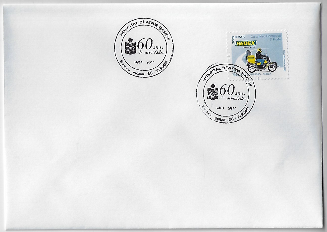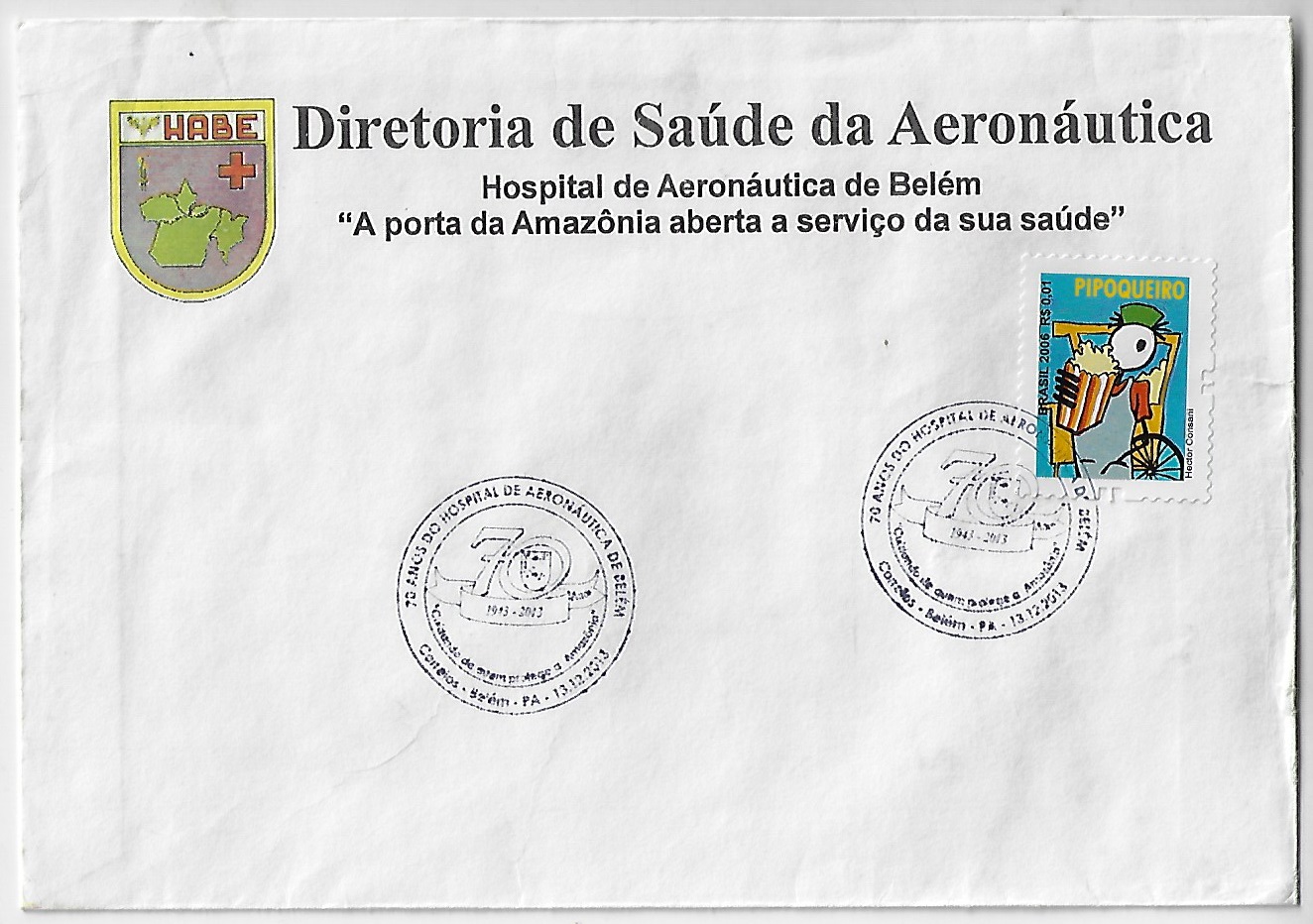 | 81082 | 2013, envelope com carimbo comemorativo alusivo aos 70 anos do Hospital de Aeronáutica de Belém, slogan "Cuidando de quem protege a Amazônia" | 10,00 | Foto |
