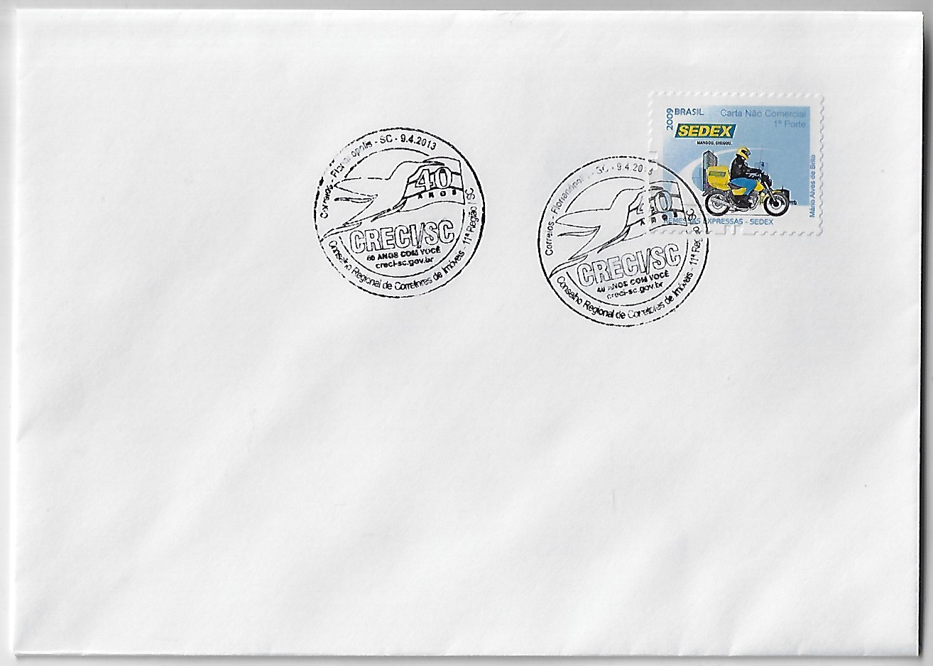 | 79285 | 2013, envelope com carimbo comemorativo aos 40 Anos do CRECI/SC - Conselho Regional de Corretores de Imóveis de Santa Catarina, de Florianópolis, ave beija-flor | 10,00 | Foto |