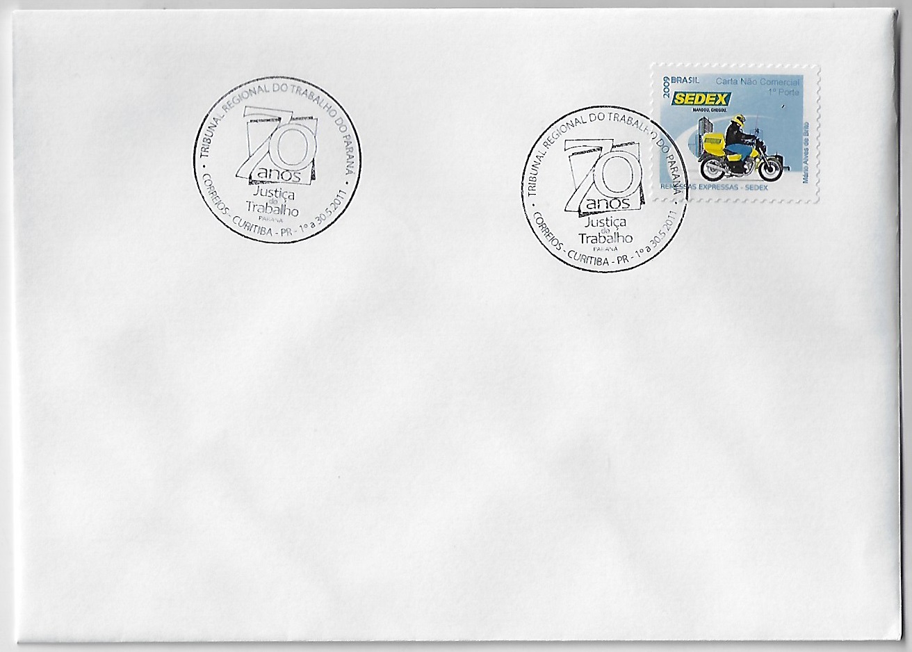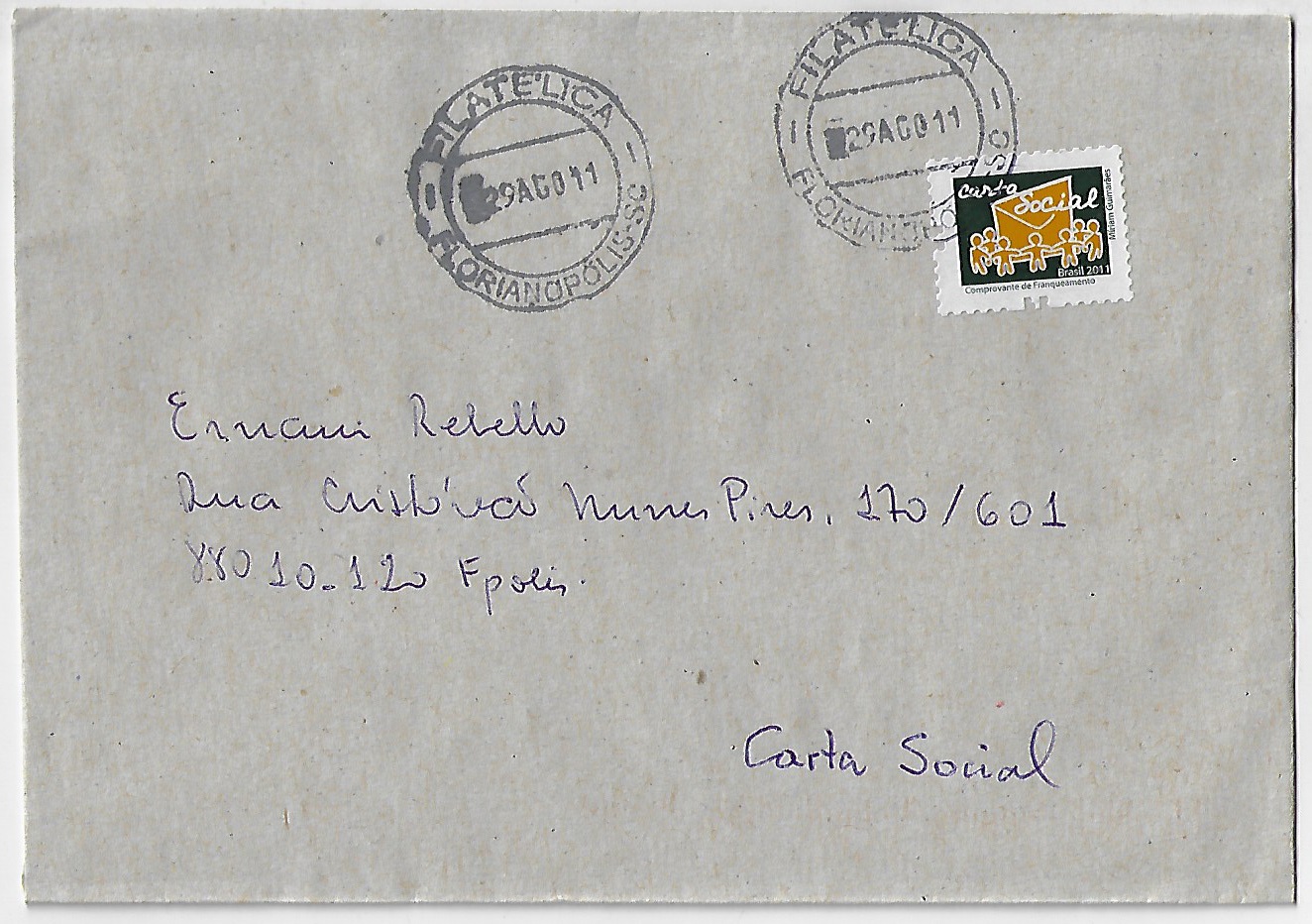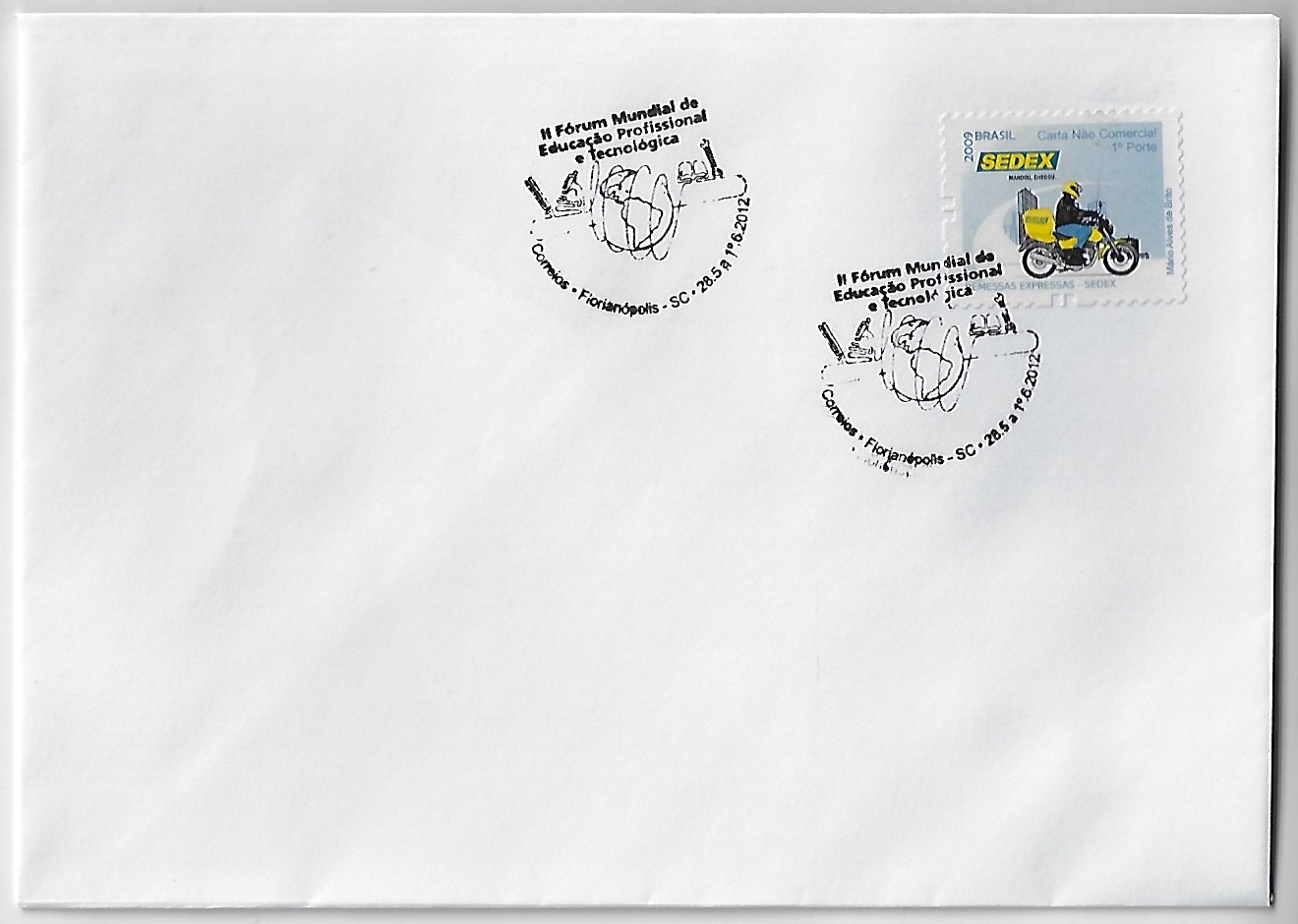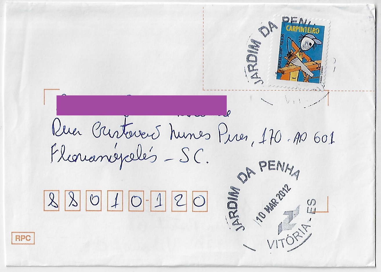 | 84456 | 2012, envelope de Vitória, agência Jardim da Penha (10/3) para Florianópolis, porteado com selo RHM-845, Profissão Carpinteiro | 10,00 | Foto |