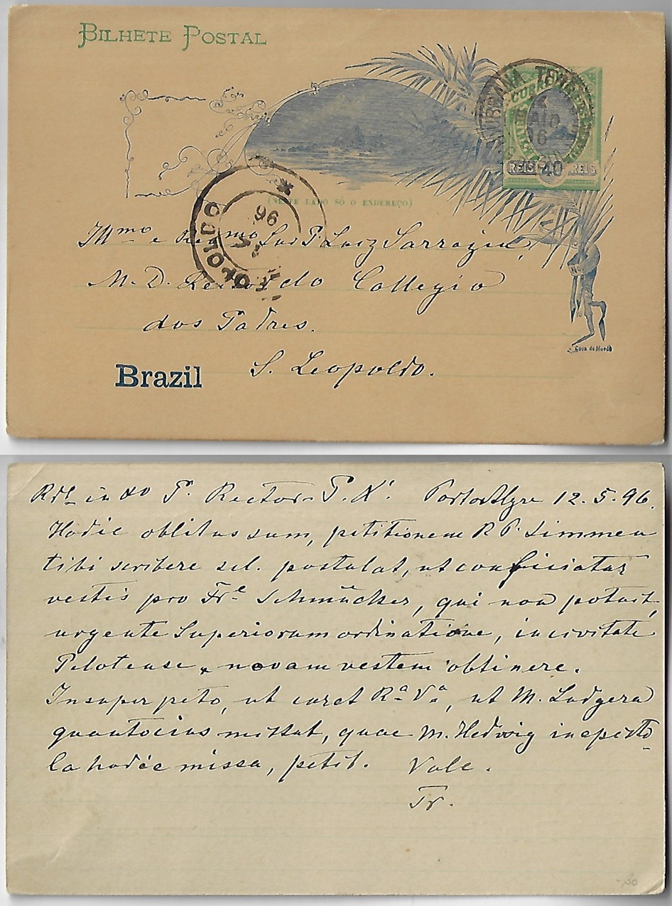 | 79754 | 1896, inteiro postal BP-43e com selo impresso Madrugada Republicana 40 Réis enviado de Porto Alegre (agência Urbana Terrestre, 14/5) para São Leopoldo (16/5) | 24,00 | Foto |