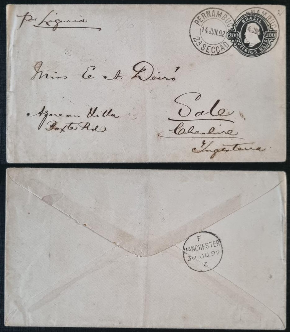 | 80051 | 1892, inteiro postal EN-3, selo 200 Réis, formato 160x90 mm com filigrana, enviado de Recife (14/6) para Sale, Grã-Bretanha, passagem por Manchester (30/6), pelo vapor Liguria, da Pacific Steam Navigation Company | 75,00 | Foto |