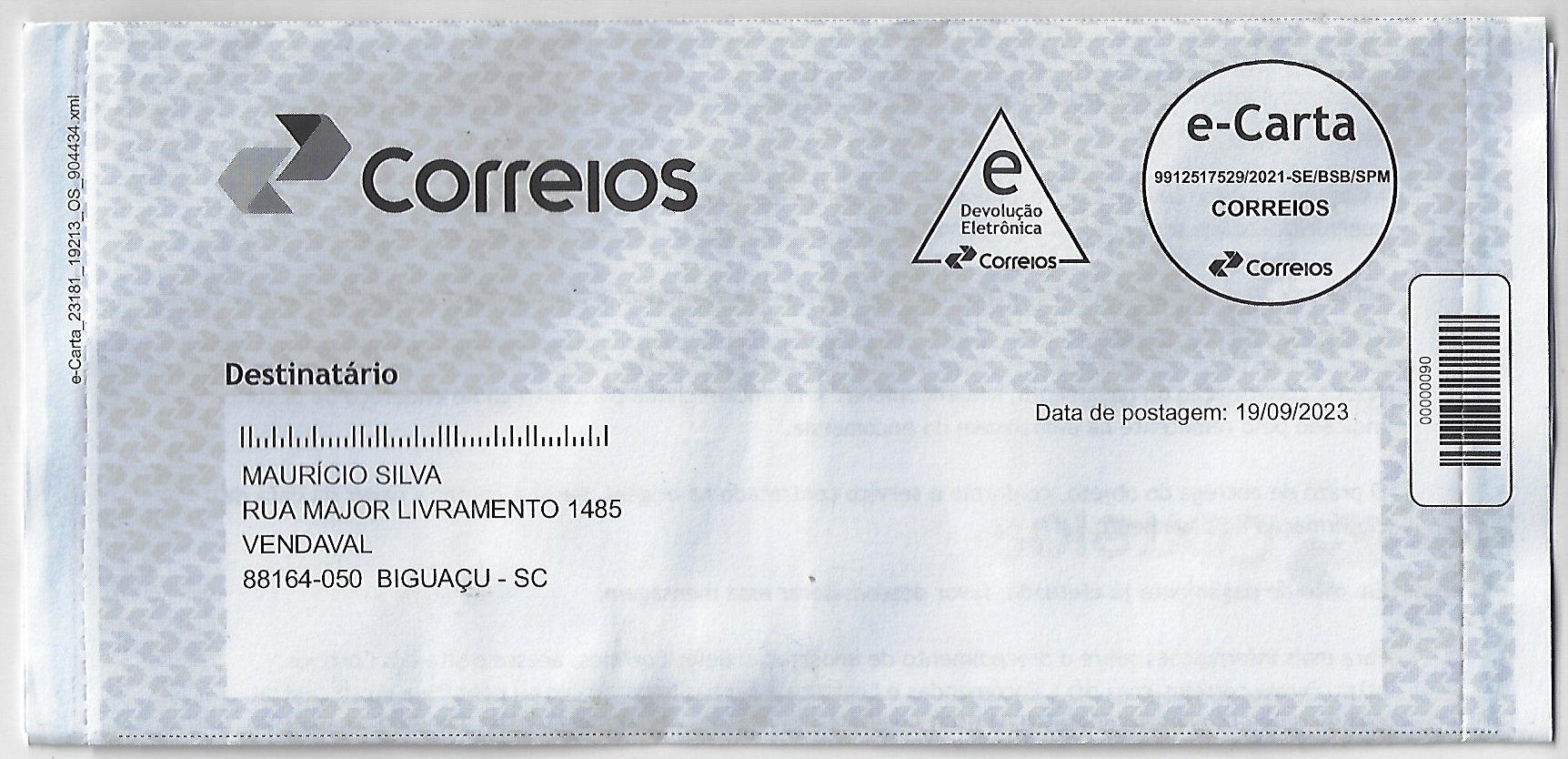 | 80632 | 2023, e-Carta dos Correios enviada em 19/9 para Biguaçu, contrato SE/BSB/SPM, cobrança do serviço de Despacho Postal referente a encomenda internacional | 10,00 | Foto |