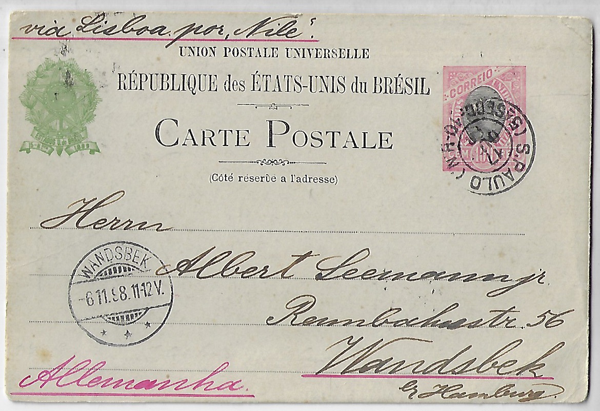 | 80939 | 1898, inteiro postal BP-56 de São Paulo (14/10) para Wandsbek / Alemanha (6/11), passagem pelo Rio de Janeiro (18/10), via Lisboa pelo vapor Nile, da Royal Mail Steam Packet Co Ltd | 75,00 | Foto |