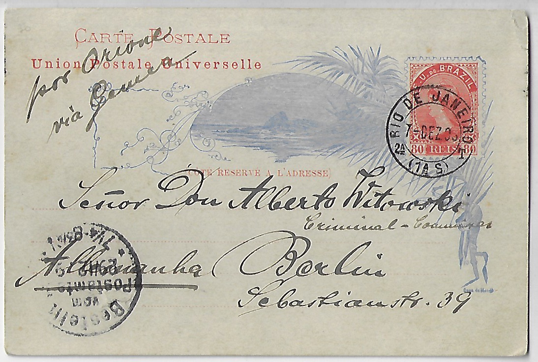 | 80945 | 1894, inteiro postal BP-30 do Rio de Janeiro (7/12) para Berlin (29/12), passagem por Gênova pelo vapor Orione da Navigazione Generale Italiana | 75,00 | Foto |