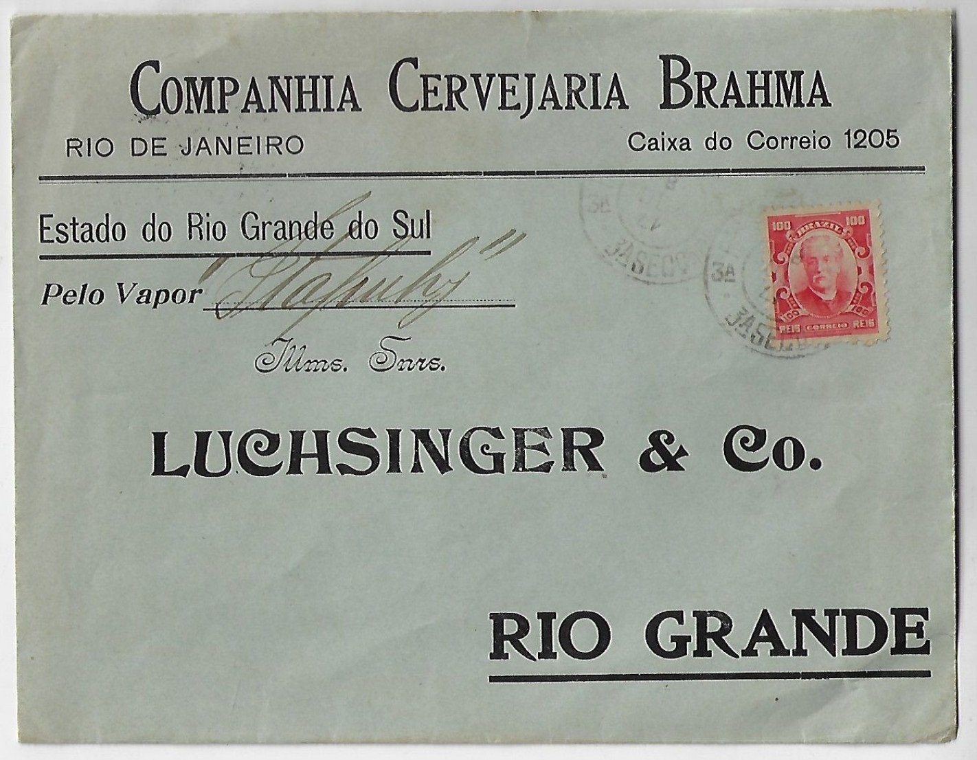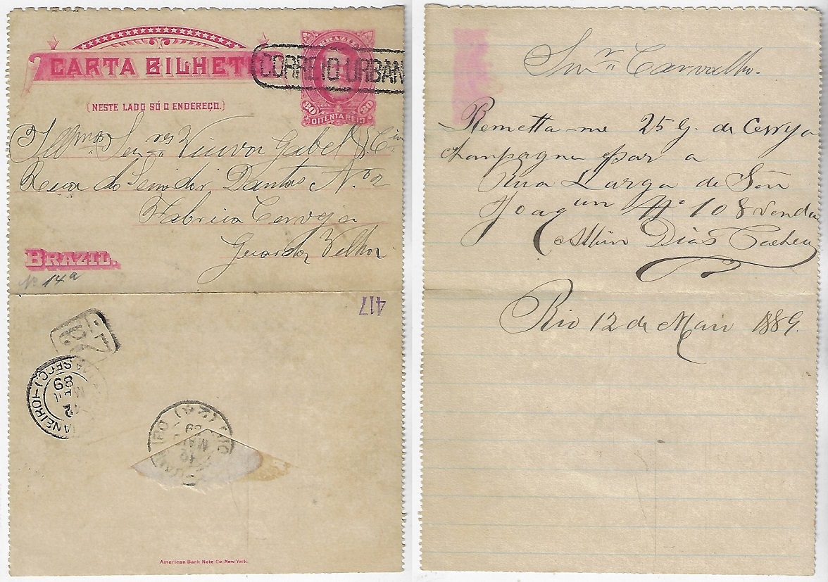 | 80989 | 1889, inteiro postal CB-18 circulado no Rio de Janeiro (12/8) e endereçado para a Fábrica de Cerveja Guarda Velha, inaugurada em 1863 e que desde 1885 tinha como responsável a viúva de Emílio Gabel, com pedido (90 UF) | 200,00 | Foto |