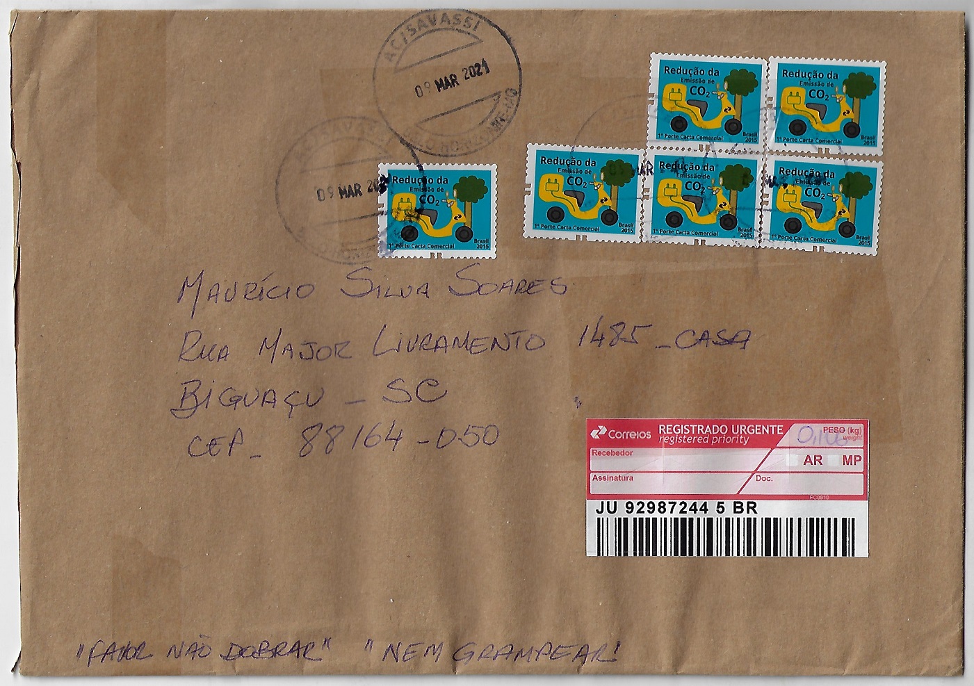| 81256 | 2021, envelope registrado enviado de Belo Horizonte, agência Savassi (9/3) para Biguaçu, porteado com 6 selos Redução de Emissão de CO2 | 10,00 | Foto |