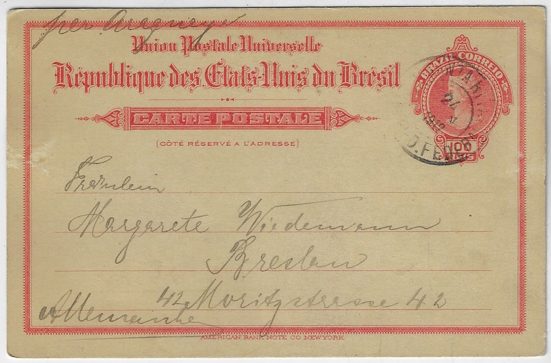 | 84547 | 1896, inteiro postal BP-51e do Rio de Janeiro (24/7) para Bremen / Alemanha (12/8), via Lisboa pelo vapor La Plata da Royal Mail Steam Packet Co Ltd | 75,00 | Foto |