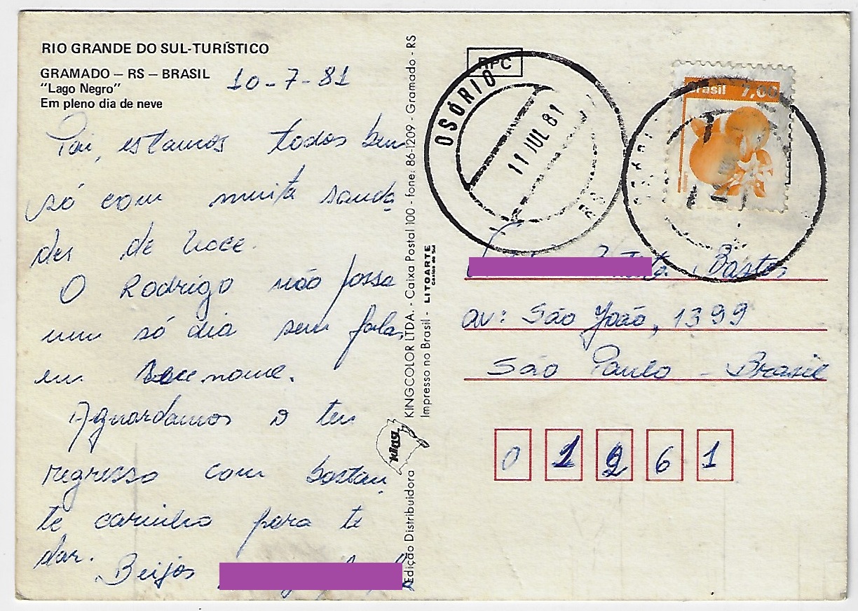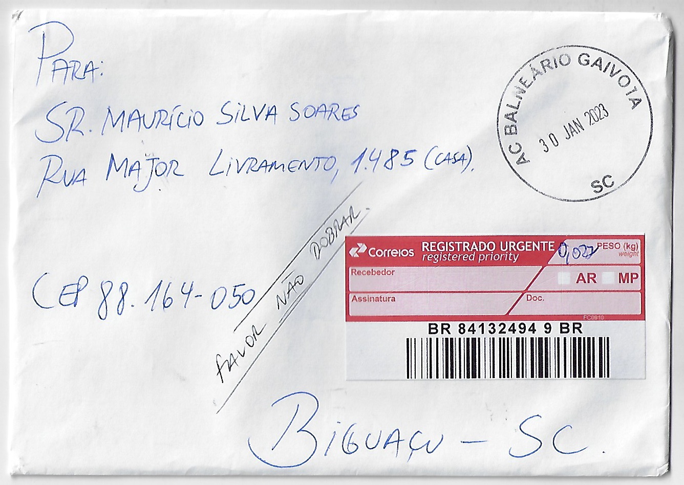 | 81362 | 2023, envelope registrado de Balneário Gaivota (30/1) para Biguaçu | 10,00 | Foto |