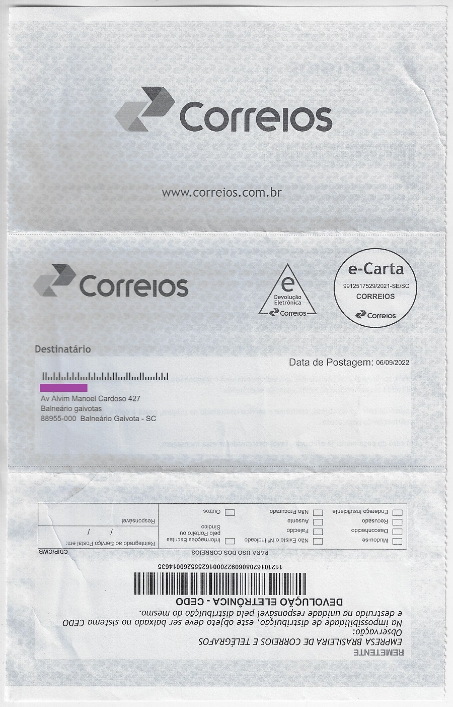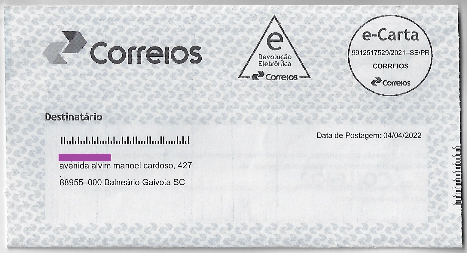 | 83914 | 2022, e-Carta dos Correios enviada em 6/9 para Balneário Gaivota, contrato SE/SC, cobrança do serviço de Despacho Postal referente a encomenda internacional | 10,00 | Foto |
