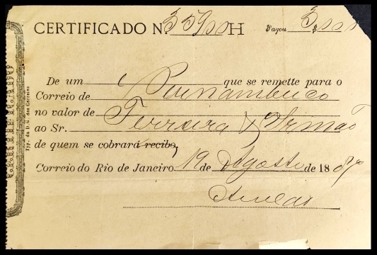 | 81516 | 1887, certificado de envio registrado do Rio de Janeiro para Pernambuco | 20,00 | Foto |