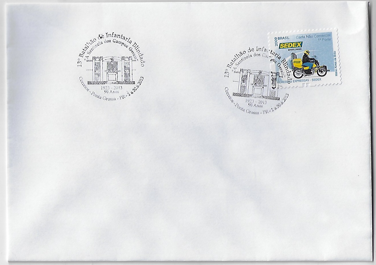 | 81723 | 2013, envelope com carimbo comemorativo aos 90 anos do 13º Batalhão de Infantaria Blindado, de Ponta Grossa | 10,00 | Foto |