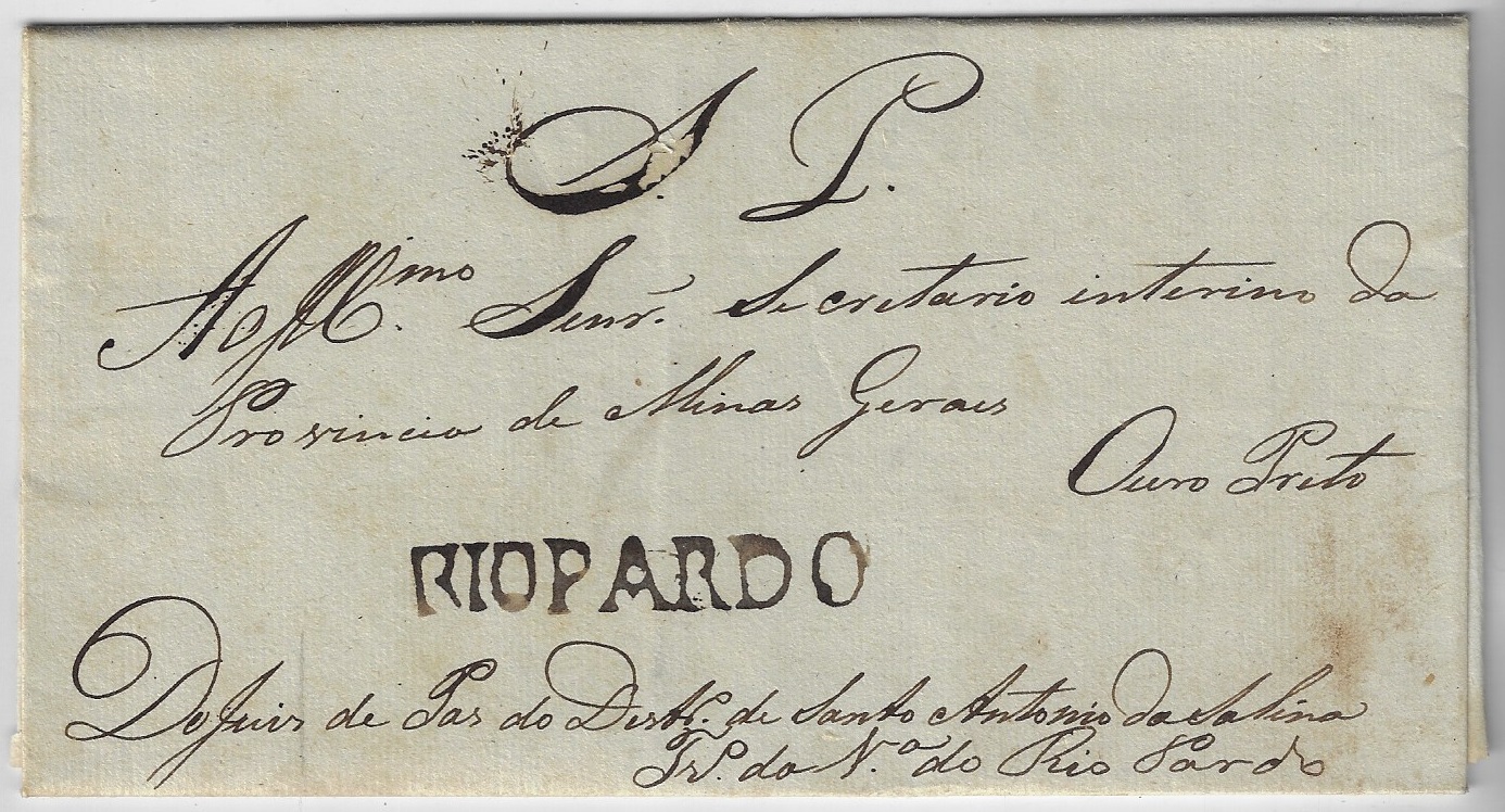 | 81995 | 1838, fold cover SP - Serviço Público enviado de Rio Pardo para Ouro Preto, carimbo pré-filatélicao P-MG-55 (5.000 UF) | 5000,00 | Foto |