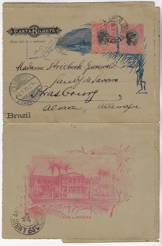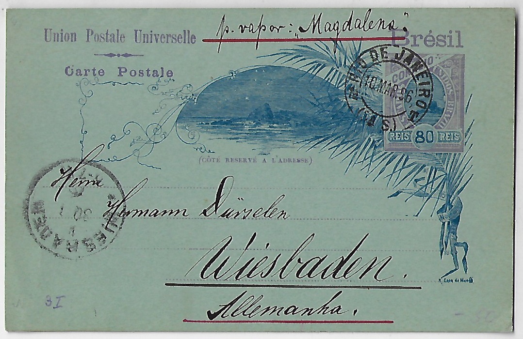 | 82224 | 1896, inteiro postal BP-50L do Rio de Janeiro (10/3) para Wiesbaden / Alemanha (30/3), pelo vapor Magdalena da Royal Mail Steam Packet Co Ltd | 100,00 | Foto |