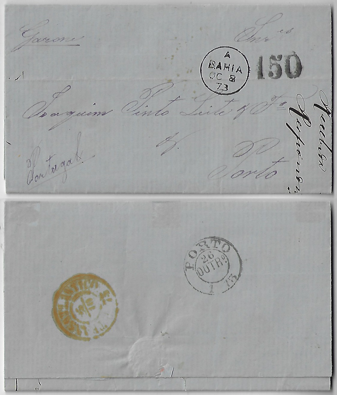 | 82471 | 1873, fold cover enviado da Bahia (6/10) para Porto / Portugal (26/10), carimbo circular “P. Transatlantico” em laranja, indicação manuscrita pelo Garonne, da Pacific Steam Navigation Company, porte português carimbado 150 Réis | 235,00 | Foto |