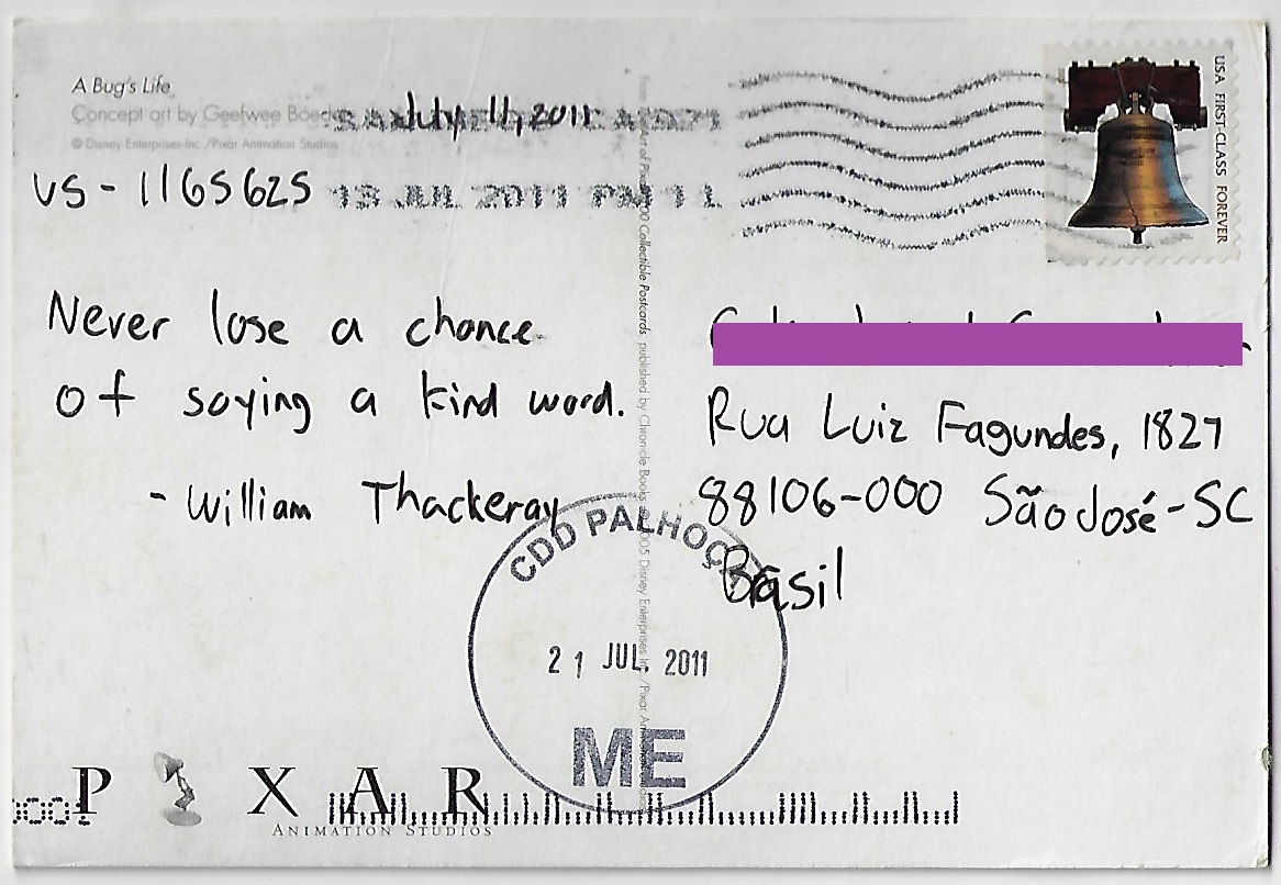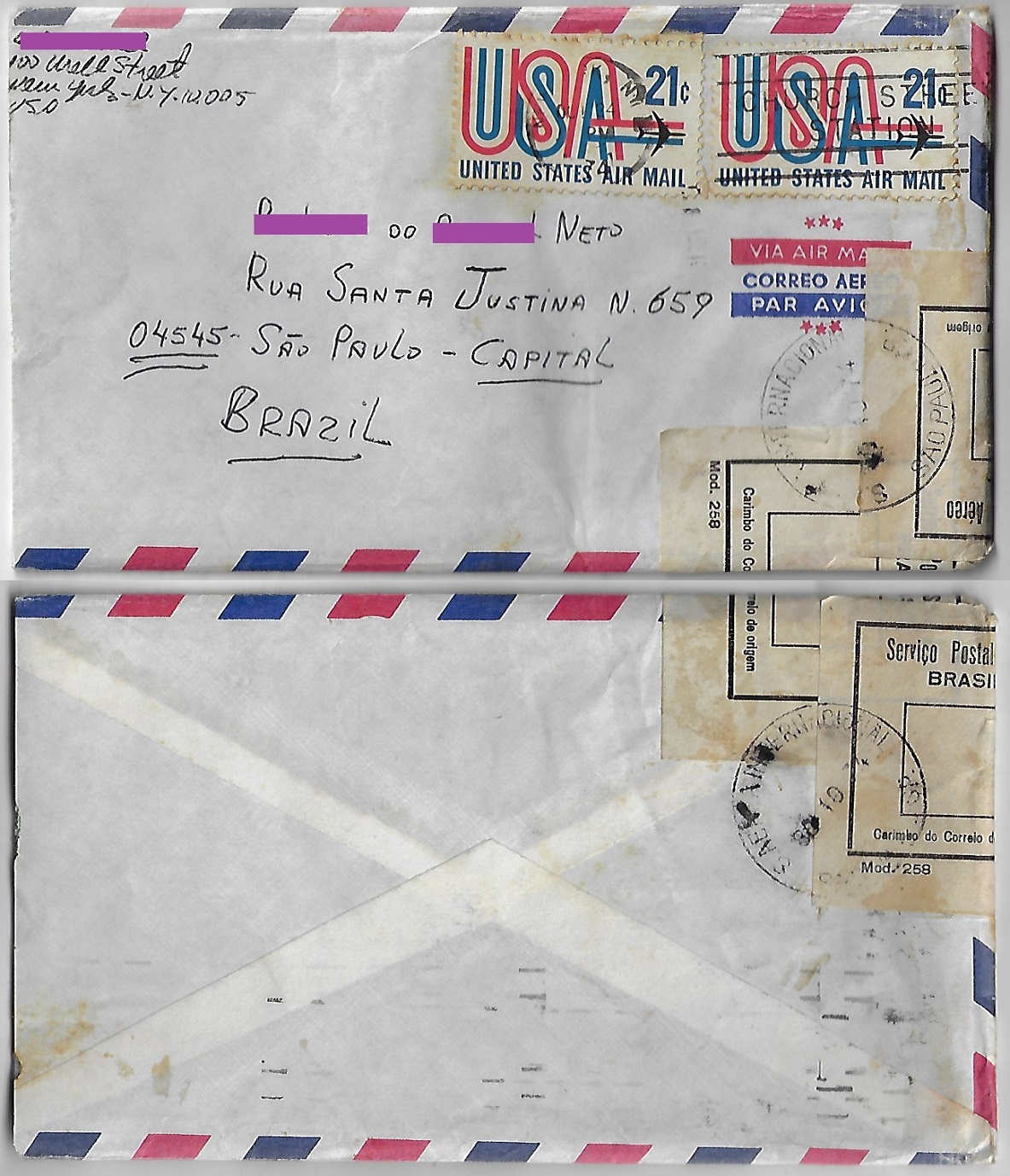 | 82273 | 2021, envelope enviado de New York para Balneário Gaivota, porteado com 5 selos, carimbo ME = Mal Encaminhado para Botucatu, marca de triagem eletrônica no verso | 10,00 | Foto |
