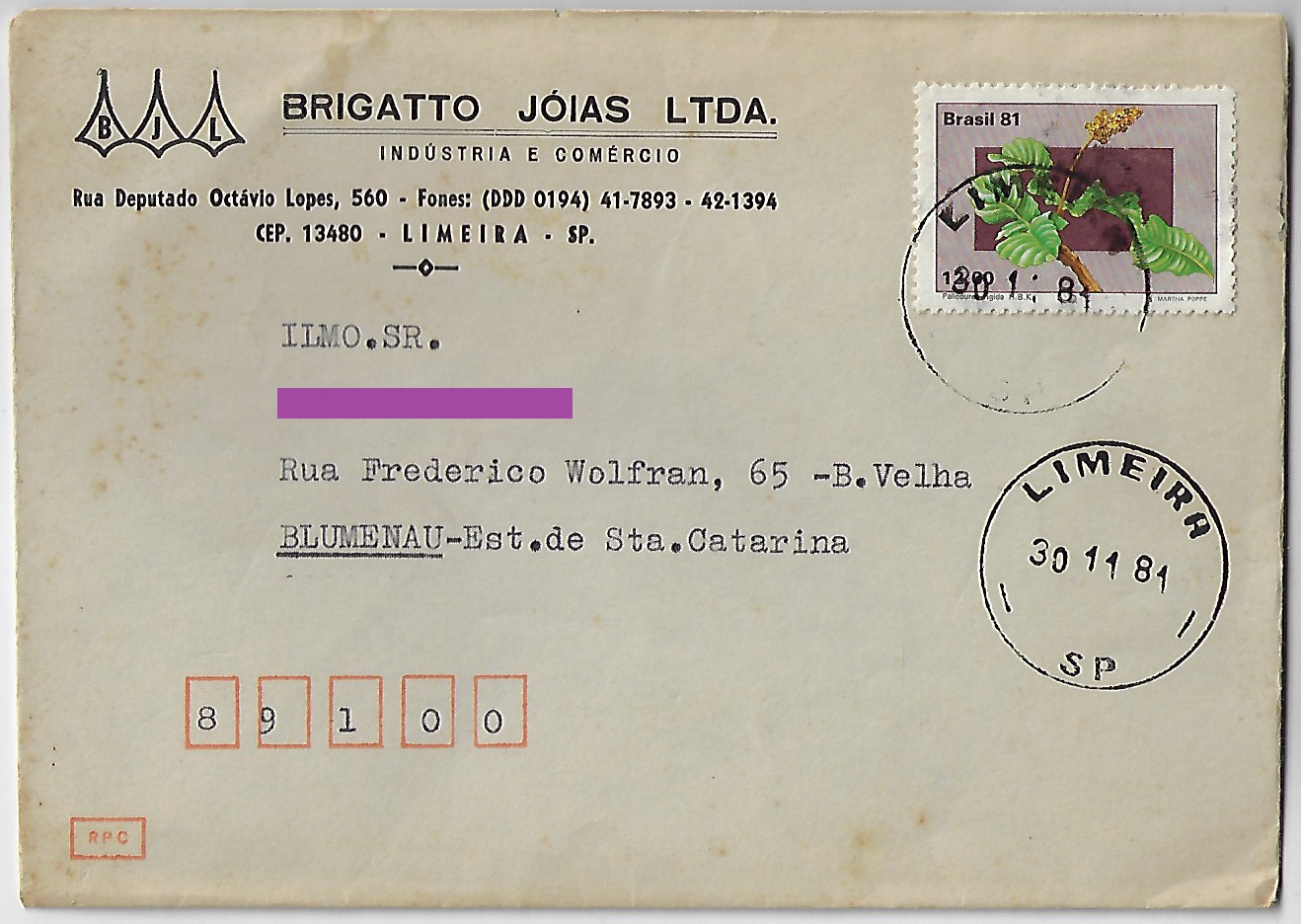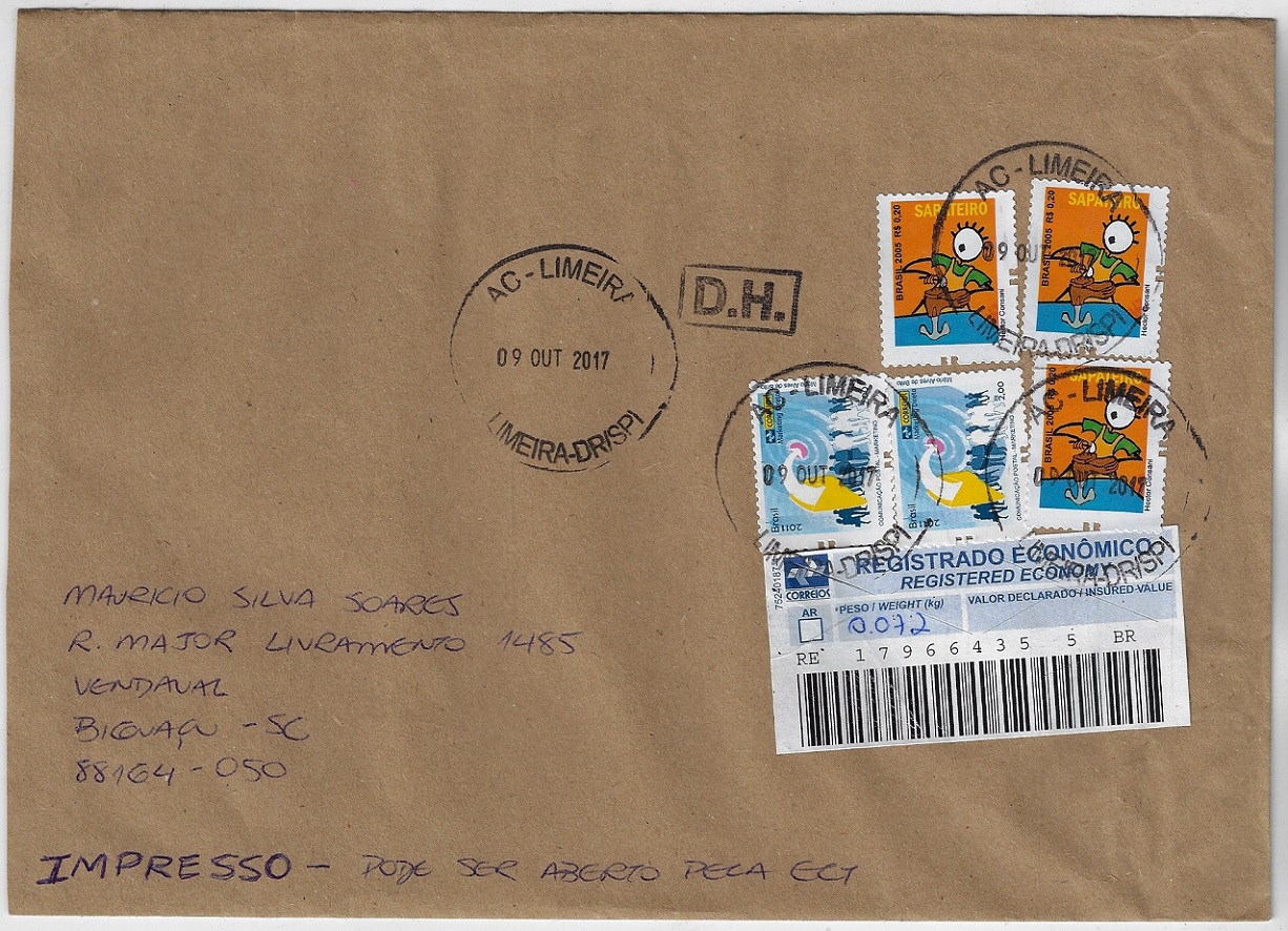 | 83299 | 2017, envelope registrado de Limeira para Biguaçu com etiqueta de registro código de barras, econômica azul com logo | 10,00 | Foto |