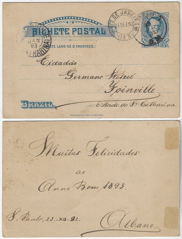 | 83564 | 1892, Inteiro postal BP-14, D. Pedro II, 40 Réis, enviado de São Paulo (23/12), passagem pelo Rio de Janeiro (24/12), para Joinville (4/1) (80 UF) | 80,00 | Foto |