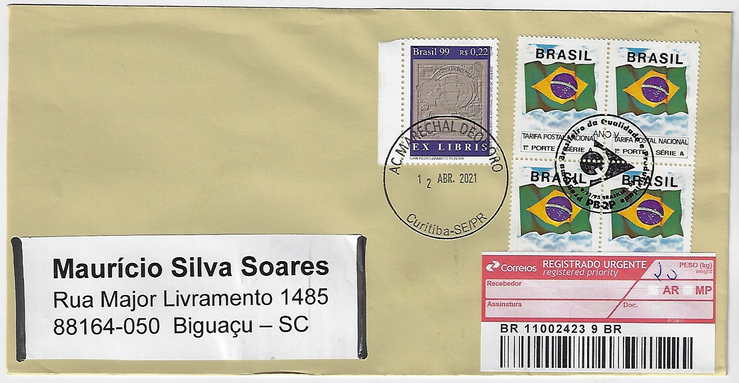| 83627 | 2021, envelope registrado de Curitiba (Agência Marechal Deodoro) para Biguaçu, quadra com carimbo comemorativo ao Programa Brasileiro da Qualidade e Produtividade | 40,00 | Foto |