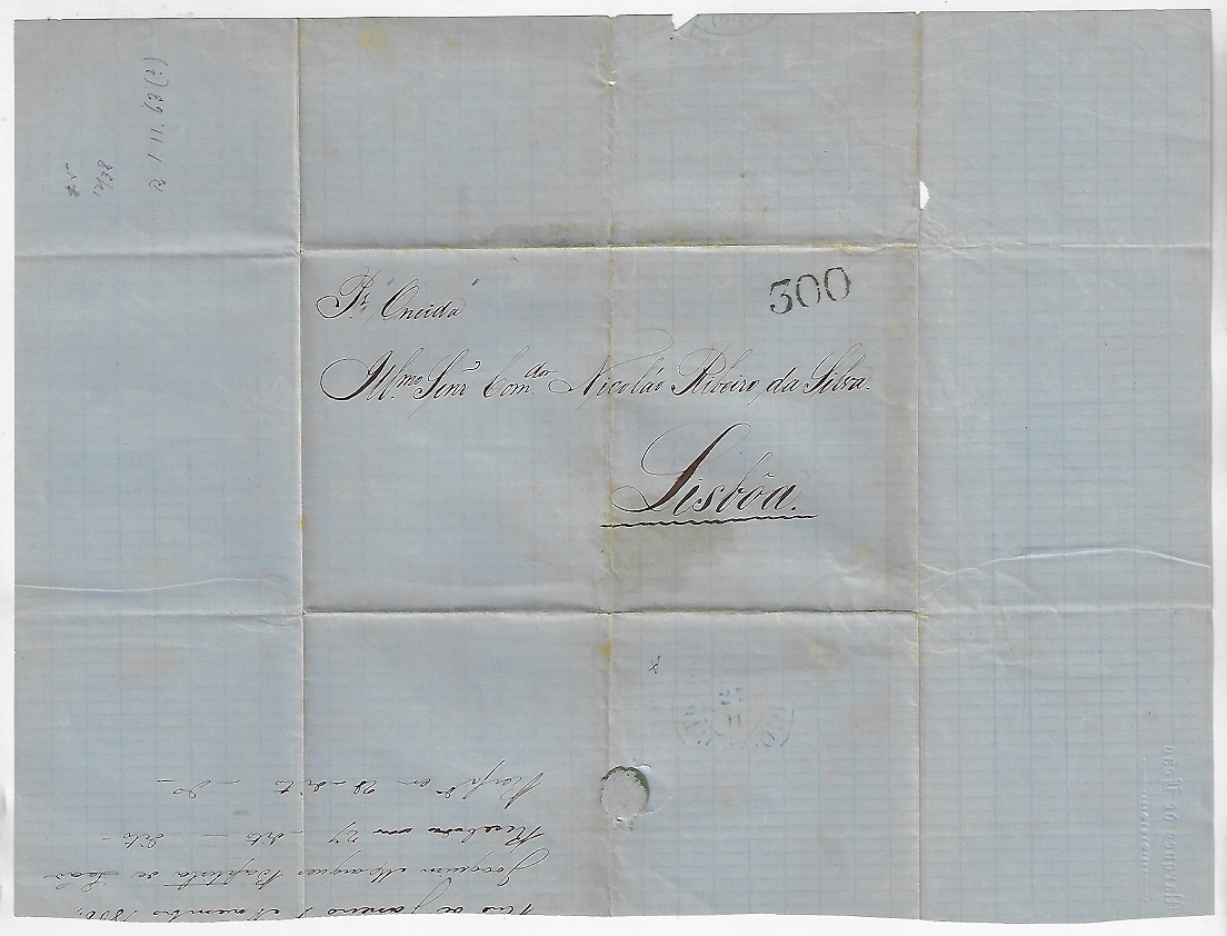 | 83670 | 1860, frente de fold cover do Rio de Janeiro (1/11) para Lisboa, porte carimbado 300 Réis Taxa portuguesa (2º porte) e identificação manuscrita de ter sido transportado pelo Vapor Oneida, da Royal Mail Steam Packet Co | 107,00 | Foto |