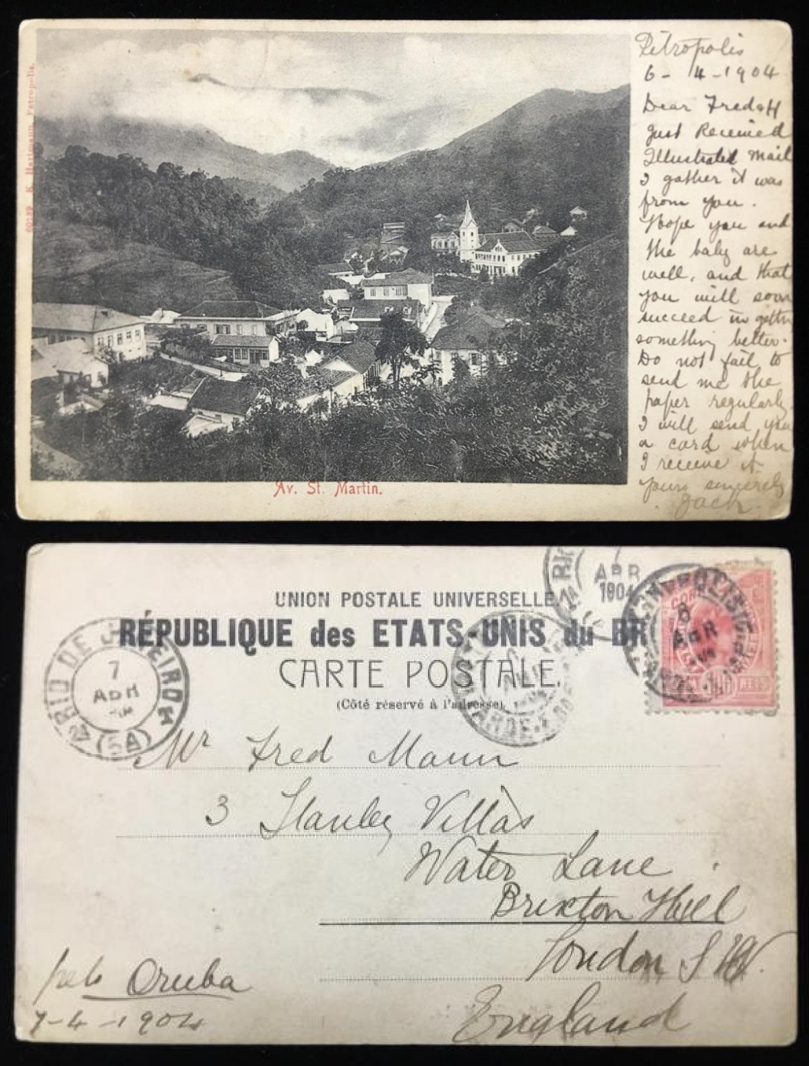 | 83799 | 1904, cartão postal com foto monocromática da Avenida St. Martin, em Petrópolis, Editor K. Hartmann, nº 60239, enviado para Londres / Grã-Bretanha com selo Madrugada 100 Réis (danificado), indicação manuscrita pelo Oruba (navio a vapor da RMSPC) | 75,00 | Foto |