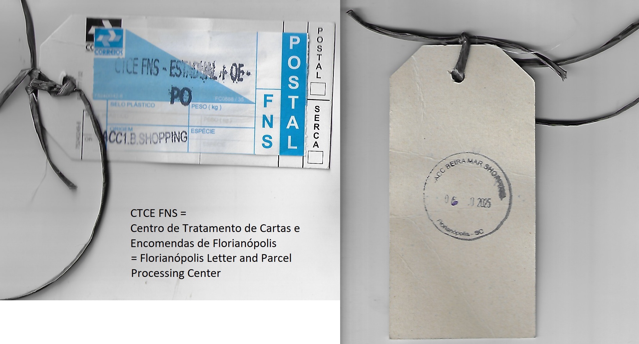 | 83860 | 2025, tag de malote dos Correios enviado de Florianópolis, agência Beira Mar Shopping (6/8) | 20,00 | Foto |