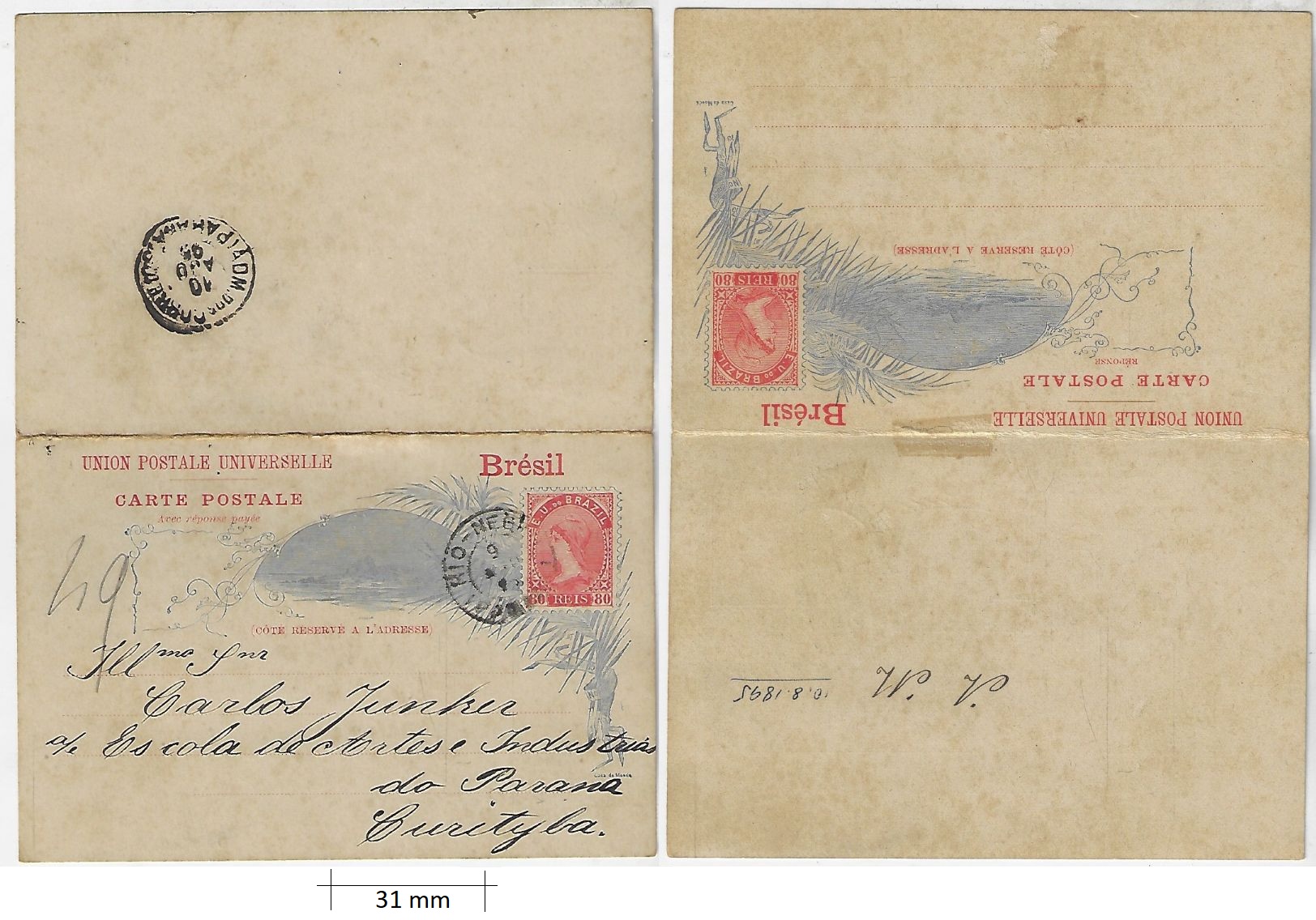 | 84018 | 1895, Inteiro Postal BP-40 de Rio Negro / Paraná (9/8) para Curitiba (10/8), embora 80 Réis fosse o valor do porte internacional foi utilizado dentro do Brasil (2.400 UF) | 2400,00 | Foto |