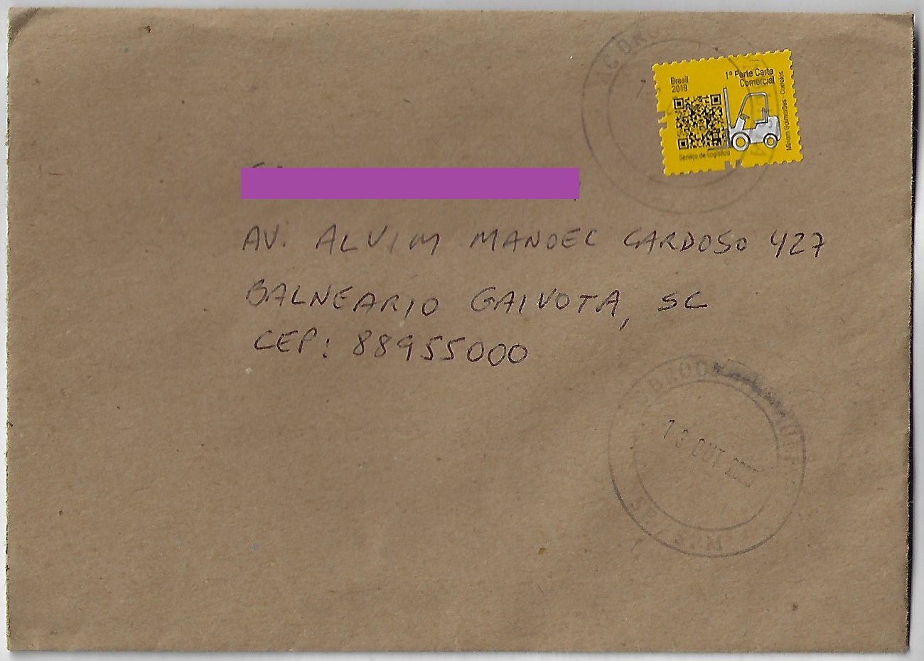 | 84253 | 2025, envelope registrado enviado de São Paulo (13/10) para Balneário Gaivota, porteado selo Serviço de Logística, Empilhadeira | 10,00 | Foto |