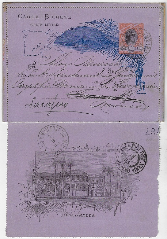 | 84399 | 1895, inteiro postal CB-60, do Rio de Janeiro (14/8) para Travnik (7/9) e reendereçado para Sarajevo (8/9), ambas na atual Bósnia e Herzegovina, na época Império Austro-Húngaro, endereçado a tenente da polícia, 2 carimbos militares no verso (50 UF) | 65,00 | Foto |