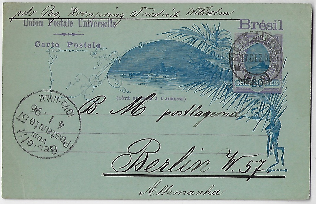| 84433 | 1896, inteiro postal BP-51e do Rio de Janeiro (17/12) para Berlin / Alemanha (4/1), pelo vapor Kronprinz Friedrich Wilhelm da Norddeutscher Lloyd Bremen | 75,00 | Foto |