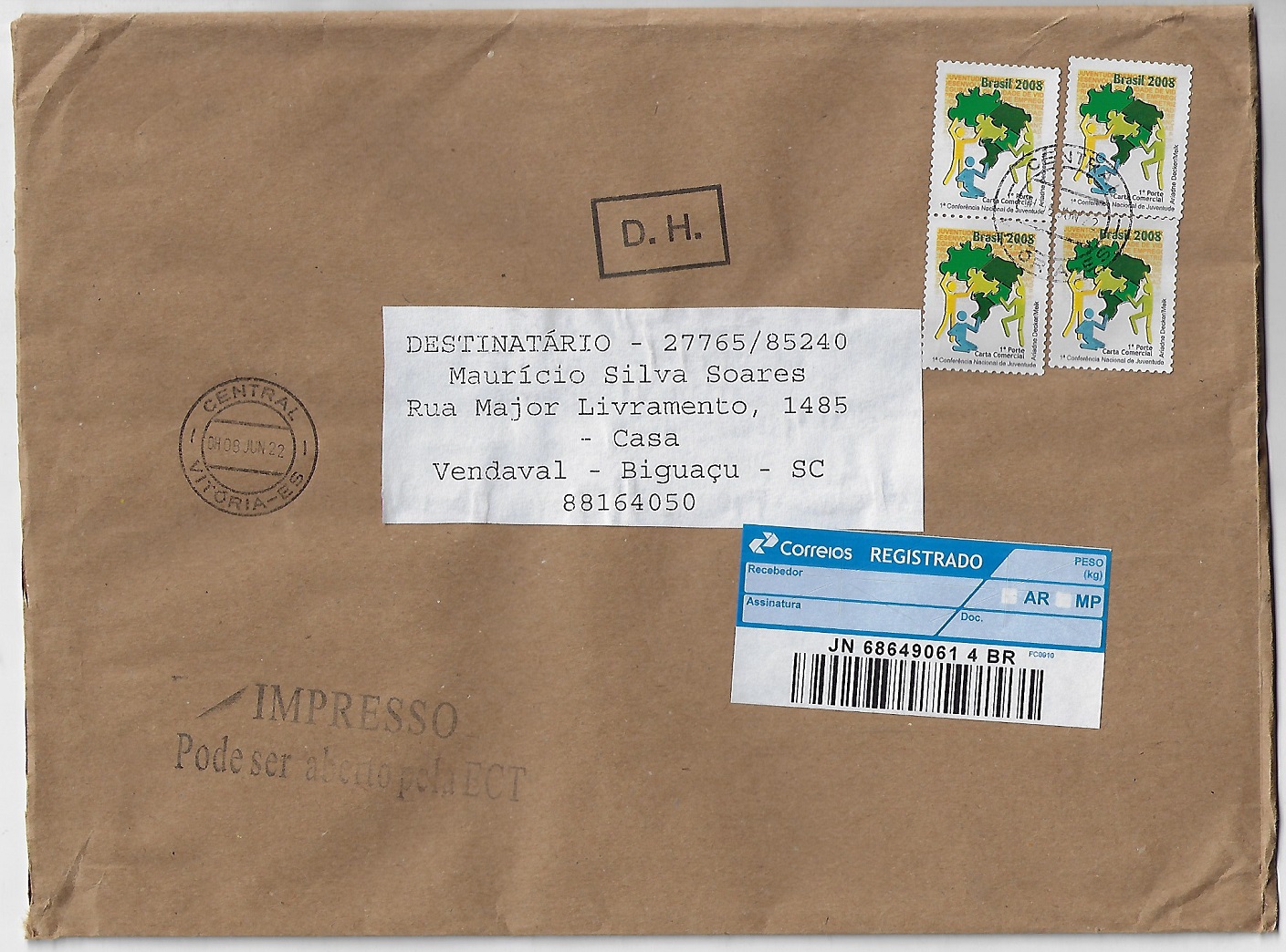 | 82903 | 2021, envelope registrado enviado de Serra, agência Laranjeiras (10/12) para Biguaçu, porteado com 5 selos 1ª Conferência Nacional da Juventude | 10,00 | Foto |