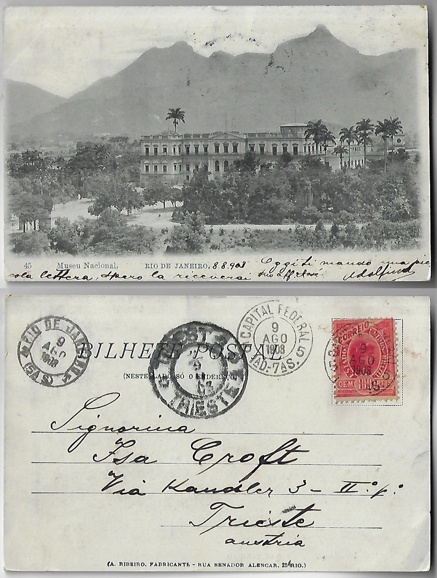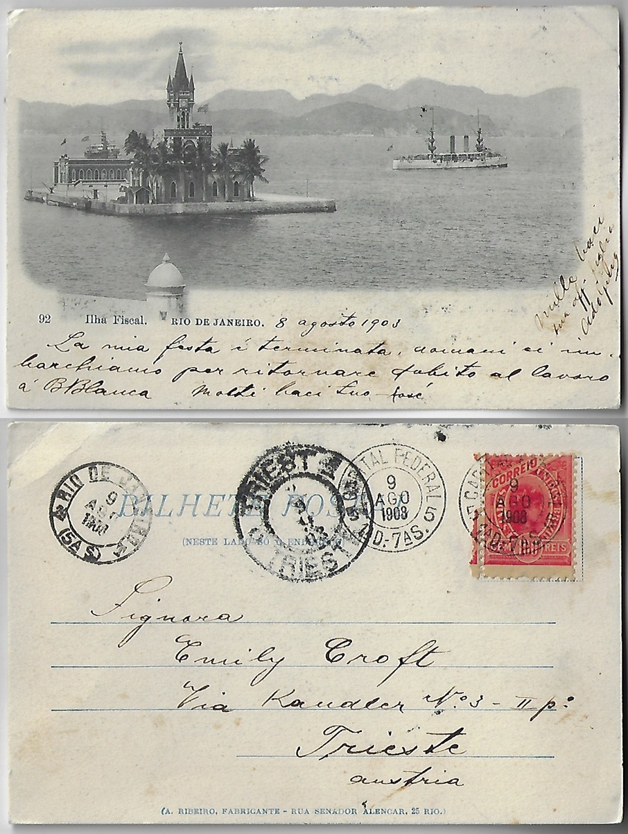 | 69658 | MG, 1906, Cartão Postal com foto monocromática da Igreja Dona Isabel, em Caxambu, enviado de Caxambu (10/4) para Rio de Janeiro, porteado com selo Madrugada 50 Réis, carimbo ferroviário "Ambulante Rio" (11/4) | 50,00 | Foto |