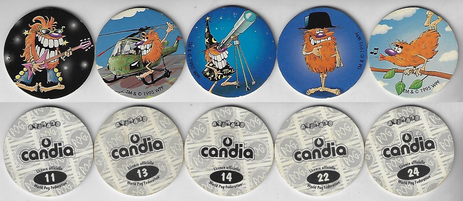 | 77095 | França, 1995, 5 tazos da coleção POG Avimage Candia, nº 11, 13, 14, 22 e 24 | 10,00 | Foto |