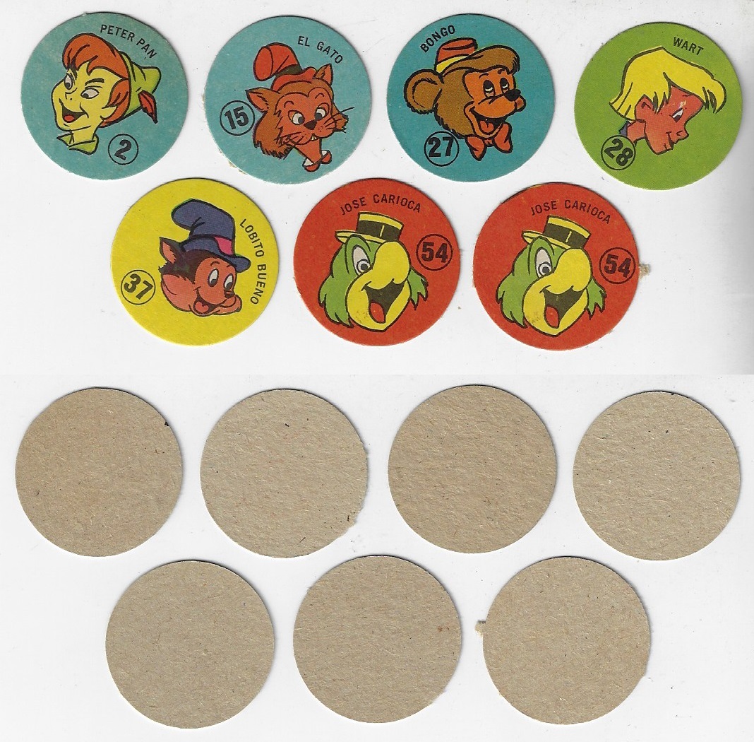 | 79299 | Argentina, anos 1980, 7 tazos (ou figurinhas redondas) retratando personagens da Disney, em papel, unifacial, diâmetro 3 cm | 10,00 | Foto |